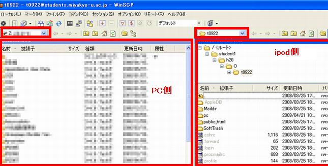 接続できたら右がipod,iphoneのファイル内容で左がPCのファイルです。